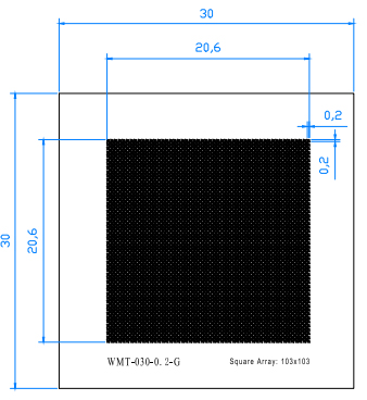 外尺寸30*30MM,有效图形面积20.6MM*20.6MM,阵列103*103,方格0.2mm*0.2mm