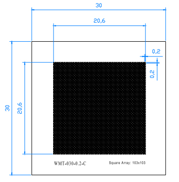 外尺寸30*30MM,有效图形面积20.6MM*20.6MM,阵列103*103,方格0.2mm*0.2mm