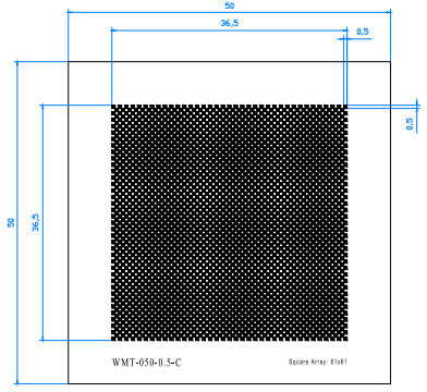 外尺寸50*50MM,有效图形面积36.5MM*36.5MM,阵列61*61,方格0.5mm*0.5mm