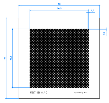 外尺寸50*50MM,有效图形面积36.5MM*36.5MM,阵列61*61,方格0.5mm*0.5mm