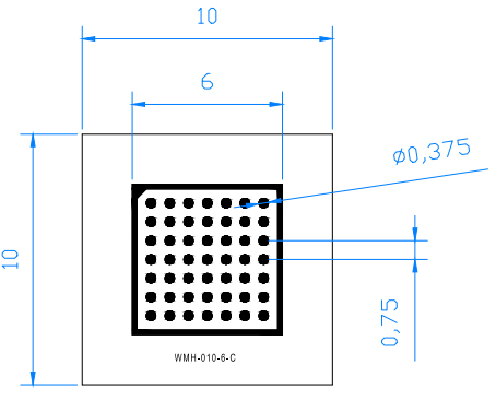 外尺寸10*10MM,有效图形面积6MM*6MM,阵列7*7,圆点直径0.375MM,圆心距0.75MM