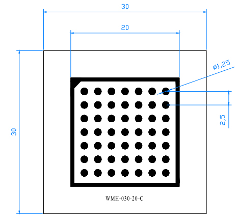 外尺寸30*30MM,有效图形面积20MM*20MM,阵列7*7,圆点直径1.25MM,圆心距2.5MM