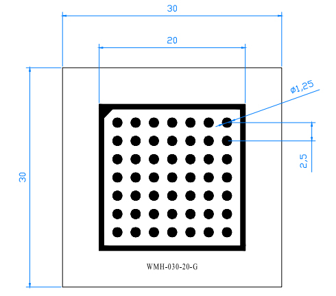 外尺寸30*30MM,有效图形面积20MM*20MM,阵列7*7,圆点直径1.25MM,圆心距2.5MM