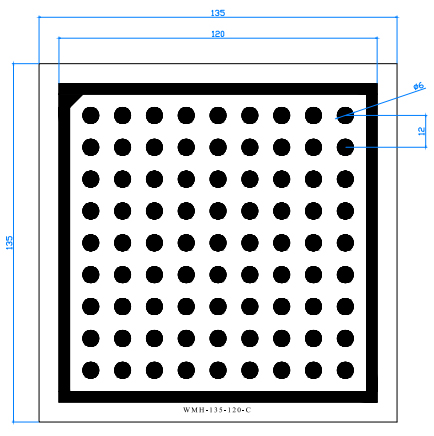 外尺寸135*135MM,有效图形面积120MM*120MM,阵列7*7,圆点直径6MM,圆心距12MM