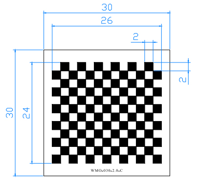陶瓷材质;图案标准精度1um; 主要特点: 1. 陶瓷白底、图案深蓝色、黑色,对比度强烈 2.漫反射特性,完全杜绝反光 3. 单个图案精度物理误差在1um以内。 4. 最大外尺寸可做到200*200MM 陶瓷板使用场景 前置光源:环形光源、条形光源、同轴光源、自然光等,这些光源都是与相机镜头处于目标物的同一侧,建议选择带有漫反射特性的陶瓷材质标定板,避免反光与透光。 针对视场 棋盘格标定板建议标定板图案尺寸为视场1/2左右,标定图案15-20幅左右,尽量将视场各个区域都拍摄到。理论上圆点中主提取精度会高于角点提取精度,要想获取更好的标定结果,建议选择圆点标定板,OpenCV也是支持圆点标定板的。