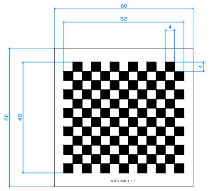 陶瓷材质;图案标准精度1um; 主要特点: 1. 陶瓷白底、图案深蓝色、黑色,对比度强烈 2.漫反射特性,完全杜绝反光 3. 单个图案精度物理误差在1um以内。 4. 最大外尺寸可做到200*200MM 陶瓷板使用场景 前置光源:环形光源、条形光源、同轴光源、自然光等,这些光源都是与相机镜头处于目标物的同一侧,建议选择带有漫反射特性的陶瓷材质标定板,避免反光与透光。 针对视场 棋盘格标定板建议标定板图案尺寸为视场1/2左右,标定图案15-20幅左右,尽量将视场各个区域都拍摄到。理论上圆点中主提取精度会高于角点提取精度,要想获取更好的标定结果,建议选择圆点标定板,OpenCV也是支持圆点标定板的。