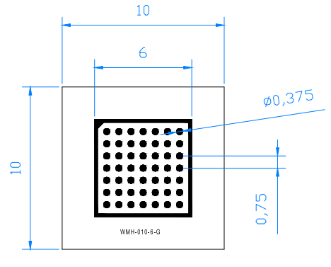 外尺寸10*10MM,有效图形面积6MM*6MM,阵列7*7,圆点直径0.375MM,圆心距0.75MM